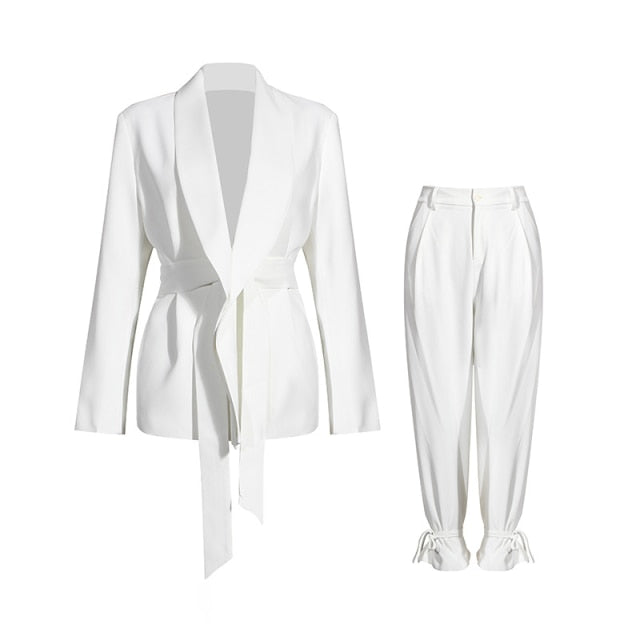 A belted shawl collar jacket with coordinating pants that ties at the ankle is the suit that makes a statement. Available in Black and White. S, M, L, XL